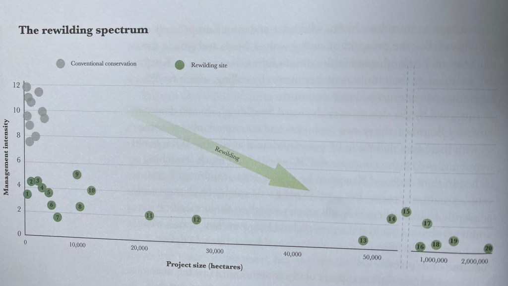 Frågan är då hur stora dessa arealer bör vara och hur mycket kan människan stå tillbaka? På egendomen Knepp, berättar författarna, att eftersom det inte finns rovdjur är de tvungna att själva avliva boskap och grisar om de blir för många. Det är dock inget problem, påpekar de, då det ger dem en inkomst. I ett gigantiskt område som Serengeti där alla delarna finns i den näringsväven är detta inte nödvändigt.