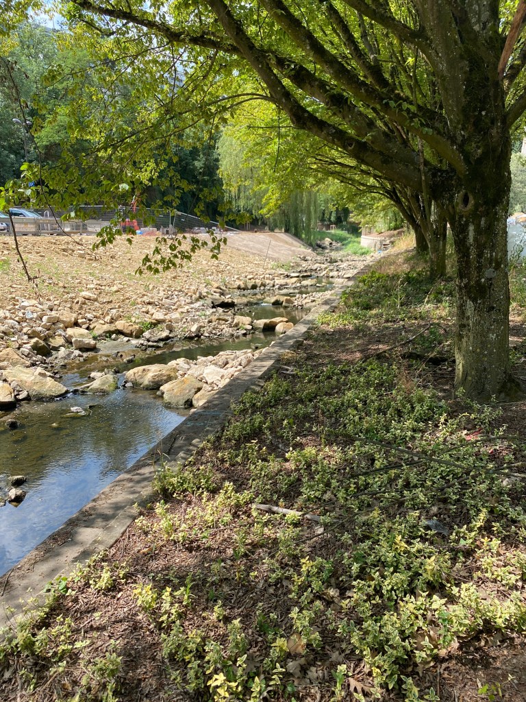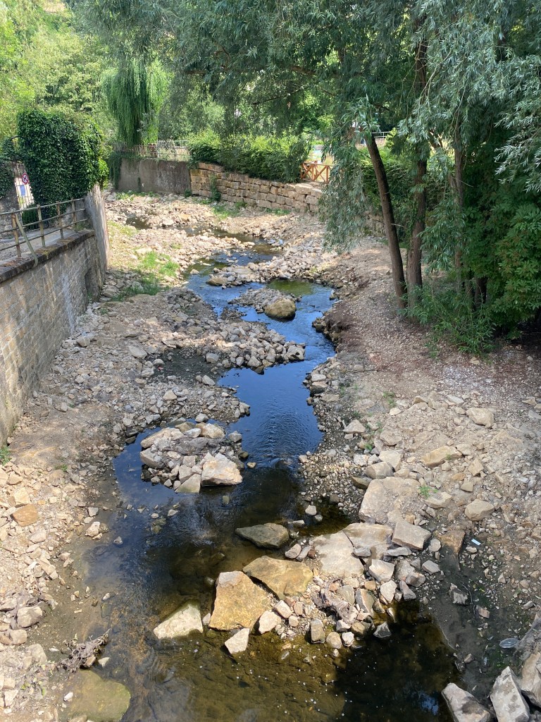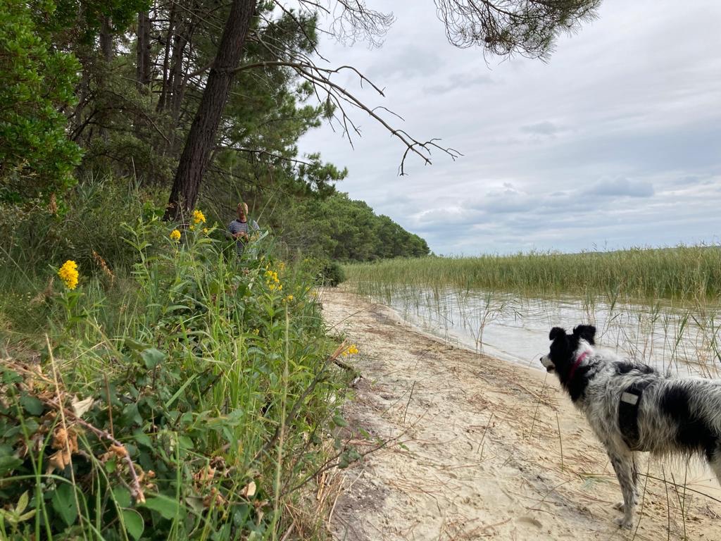 När vi kom hit efter mörkret gick vi ut och rastade henne. Vi hörde ljud från strandängen bakom träden. Dagen efter förstod vi att det var vildsvin som kände sig trygga i mörkret och i vassen trots restaurang Le Nautique med sina gäster under restaurangkjulets tak som ligger mittemot.