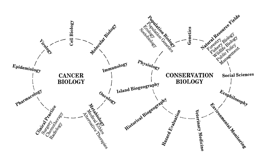 Michael Soulé skriver i artikeln ”What is conservation?” (1985) att det är en discplin som skiljer från flera andra, eftersom det är att det är en krisdisciplin. Den handlar om att åtgärda något som har gått fel. Det i sin tur betyder, fortsätter han, att man måste agera innan alla fakta finns på bordet. Svårigheten är dock att disciplinen är förbunden med en mängd andra discipliner, varav vissa inte ens är en del av biologin.