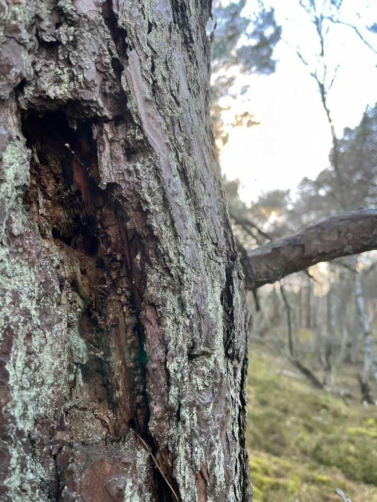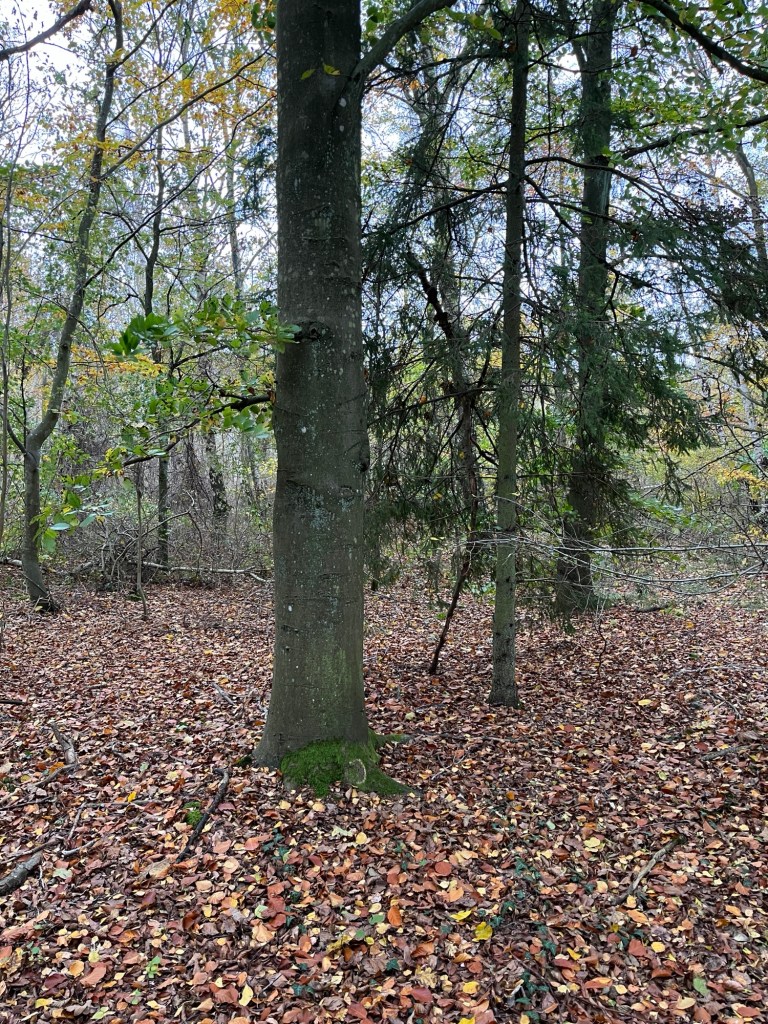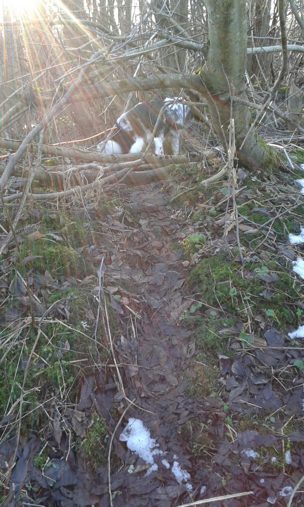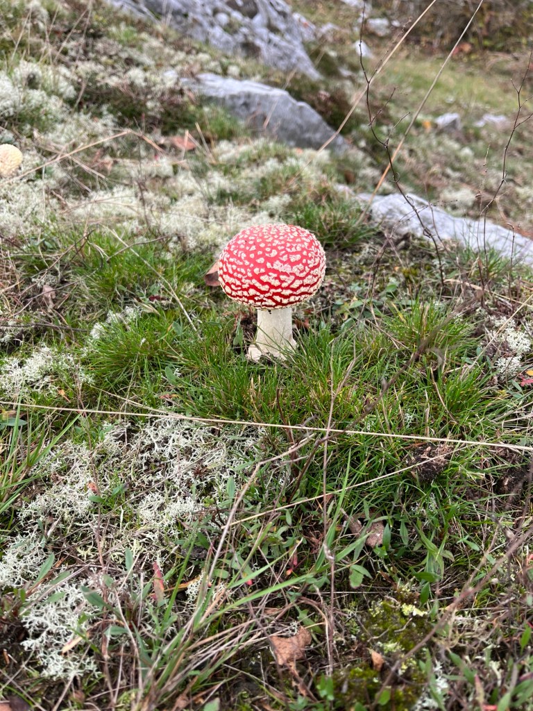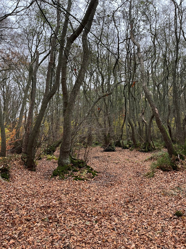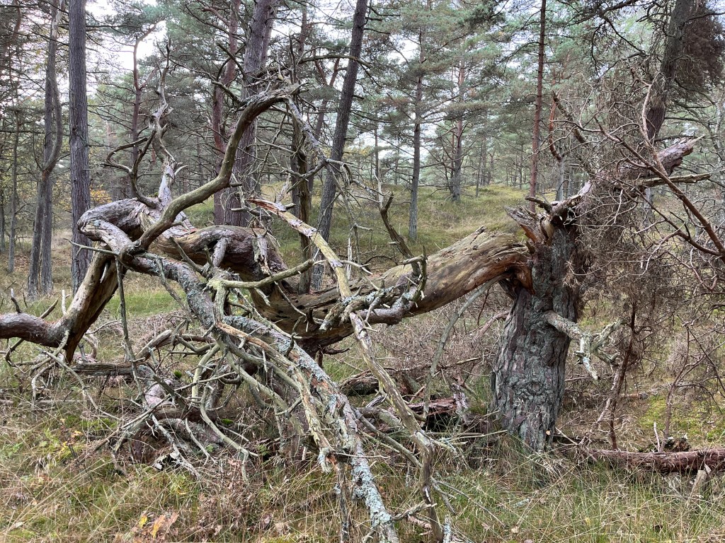 Maggie och jag kommer på ut på vägen och västerut mot parkeringen vid Sandhammaren. Hon går och nosar och jag tittar mig omkring medan tankarna rör sig. Så ser jag gullkrös växa på några nedblåsta tjocka grenar. Det svenska namnet är långt borta och istället säger jag det engelska namnet witches’ butter för mig. Gullkrös har inte fastnat på samma sätt. Jag brukar säga namnen högt för mig själv för att arters namn bättre ska förbli i minnet.