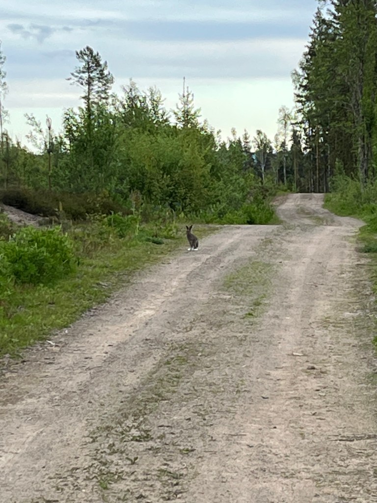 En hare sitter på skogsvägen. Vi går vid kalhygget på norra sidan. Förvånade stannar vi och tittar på den. Den verkar inte rädd. Maggie har inte märkt den. Hon nosar i vägkanten.
