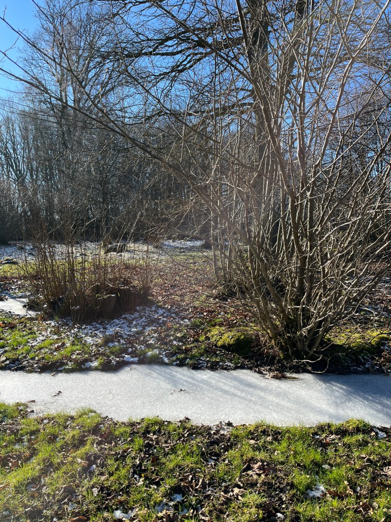 Jag fortsätter i utmarkerna och kommer in i den norra delen. Där står bokar och ekar. Det är naturbetesmark. I skötselplanen (Lundwall, 2011) läser jag att den har aldrig varit odlad eller gödslad. Det finns en damm för salamandrar och lövgrodor. Den är nu isbelagd.