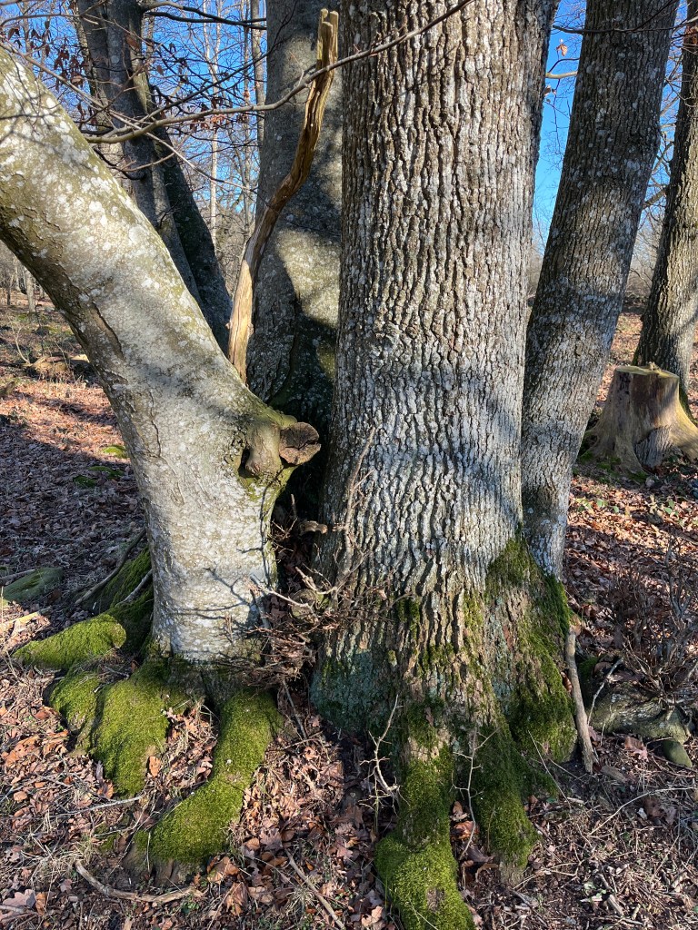 En kvartett av ek och bok får mig att stanna till. De växer tätt och ändå har de lyckats få tillräckligt med näring och ljus för att kunna växa sig höga.