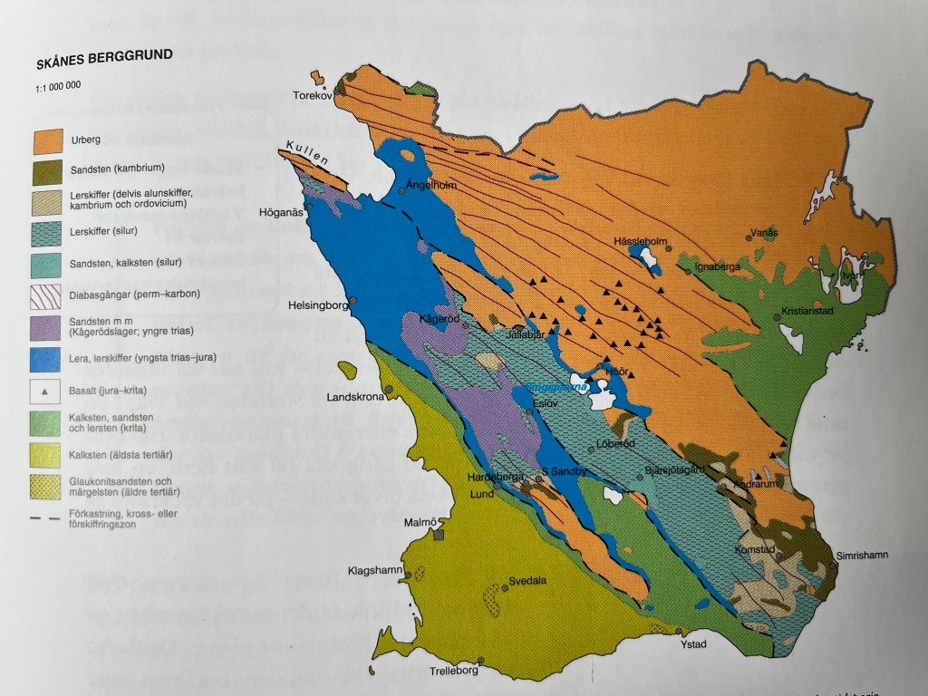 I Björks bok får man en överblick över den skånska berggrunden. Och om vi tittar på bilden nedan ser vi sandstenen från Kambrium går nordväst från Simrishamn. På kartan ser vi att Komstad är utmärkt, strax norr om den byn är Listarum.