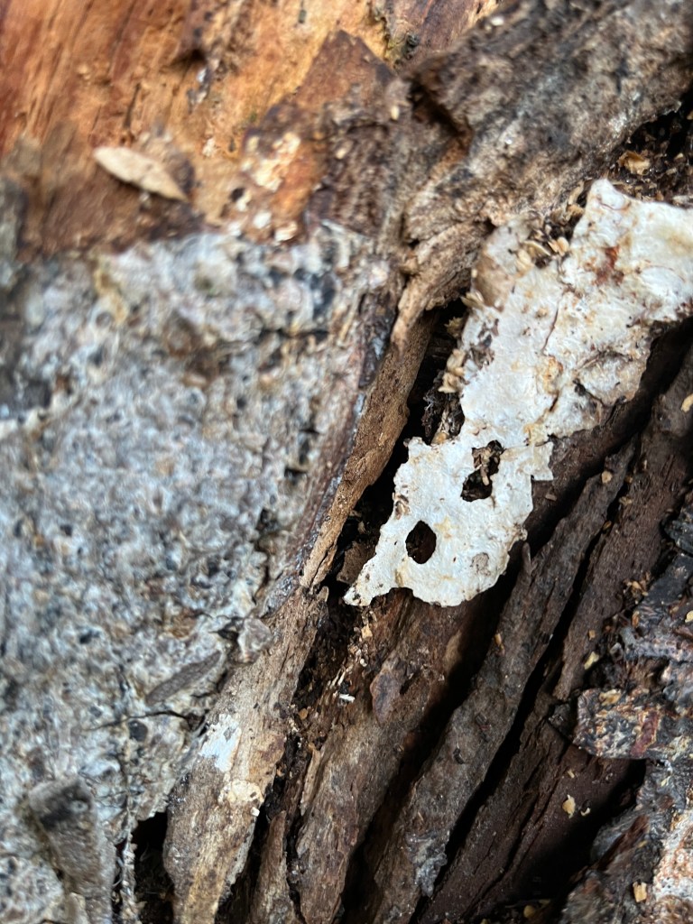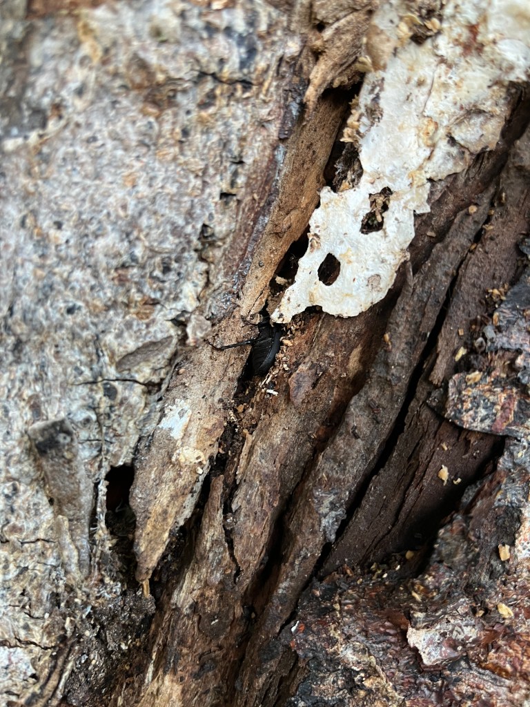 Fascinerad upptäckte jag att trädet myllrade av insekter. Jag fick syn på gråsuggor, men också svarta stora skalbaggar och en tusenfoting.